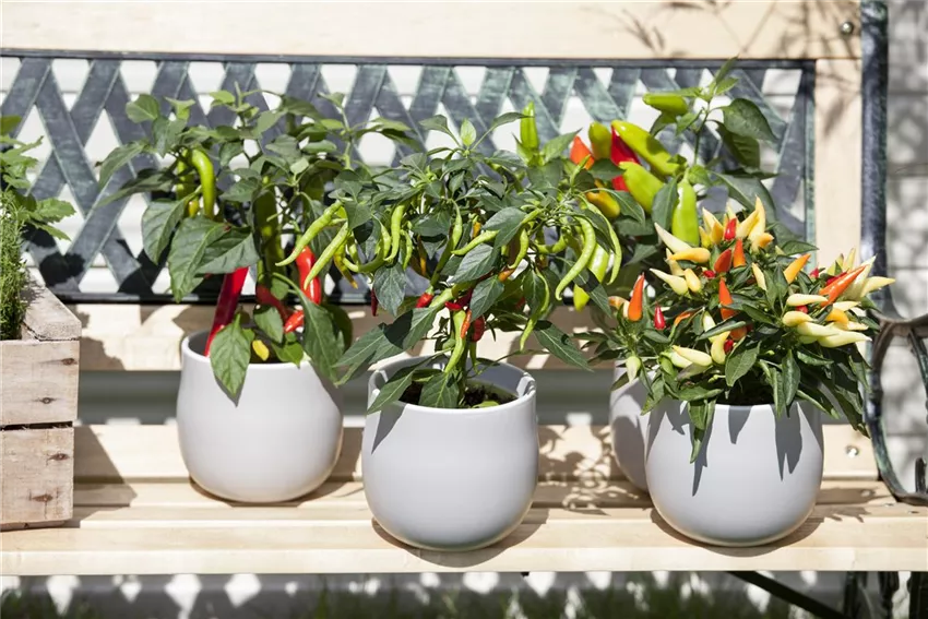 Capsicum annuum Ein Küchen- und Kräutergarten auf nur vier Quadratmetern, der außerdem Augenweide und Wohlfühloase ist? Geht nicht? Geht doch! Mit neuen aromatischen Mini-Gemüsesorten, mit Obst-Zwerggehölzen, Beerenhochstämmchen und vielen würzigen Kräutern wird selbst ein kleiner City-Balkon zum Gourmet-Paradies!