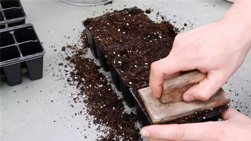 Blaukissen - Aussäen von Samen (1) Befüllen Sie die Mini-Pflanztrays mit frischer Anzuchterde und drücken Sie diese mit den Fingern oder einem Holzbrett fest.