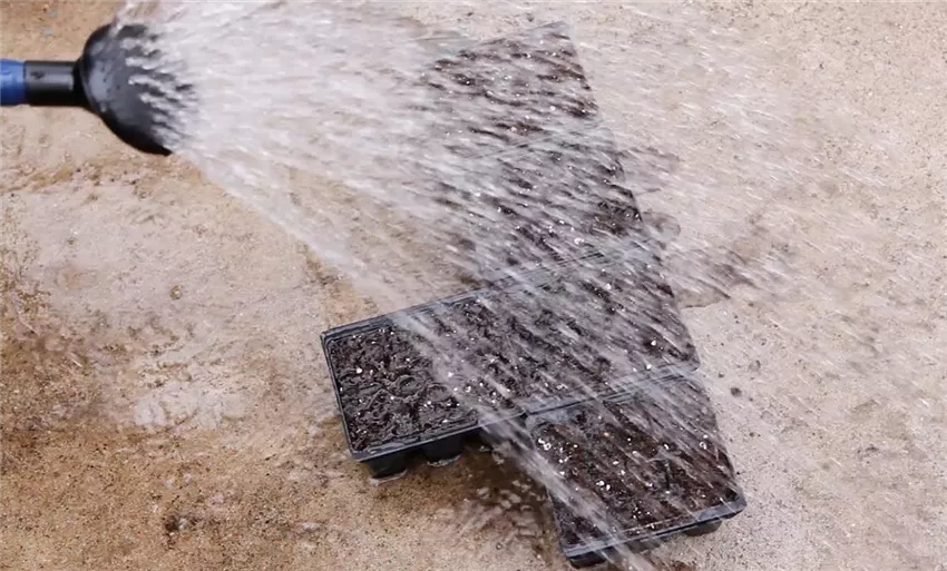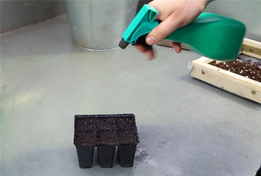 Blaukissen - Aussäen von Samen (2) Befeuchten Sie die Anzuchterde ausreichend mit zimmerwarmem Wasser. Verwenden Sie dafür entweder einen Pflanzensprüher oder eine kleine Gießkanne mit Brausekopf.