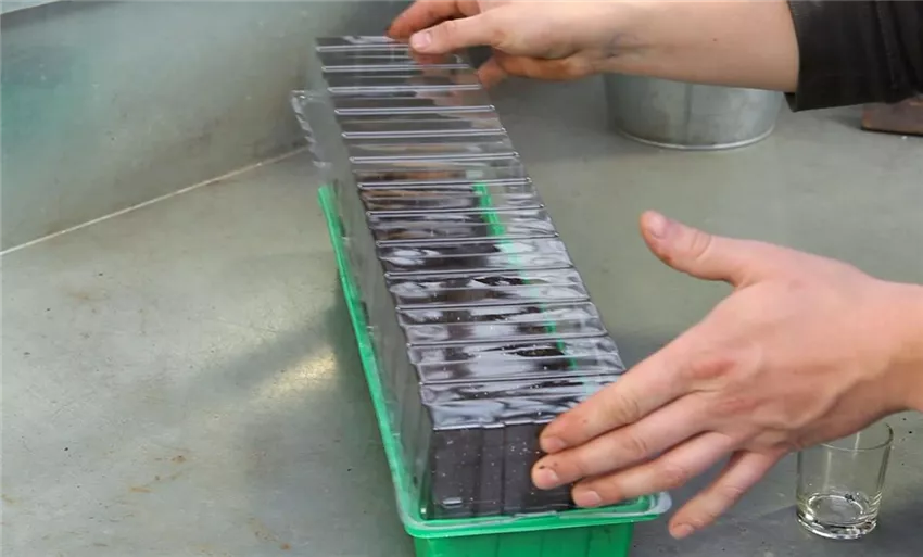 Blaukissen - Aussäen von Samen (5) Geben Sie die Minipflanzentrays in das Zimmergewächshaus. Stülpen Sie den Deckel darüber und stellen Sie das Ganze an einen hellen Platz, zum Beispiel auf eine Fensterbank.