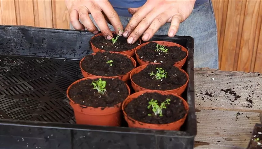 Blaukissen - Pikieren (4) Die Blaukissensämlinge können Sie gerne büschelweise in die Töpfe geben. Nehmen Sie die Jungpflanzen aus der Aussaat-Palette heraus und machen Sie mit den Fingern oder dem Pikierstäbchen ein Loch in die Anzuchterde der Pflanztöpfe. Die Jungpflanzen sollten Sie genauso tief einsetzen, wie sie vorher in Anzuchtschale gewachsen sind. Achten Sie darauf die Erde rundherum etwas anzudrücken. Das ist wichtig, um eine gute Verbindung der Wurzeln mit dem frischen Substrat zu fördern.