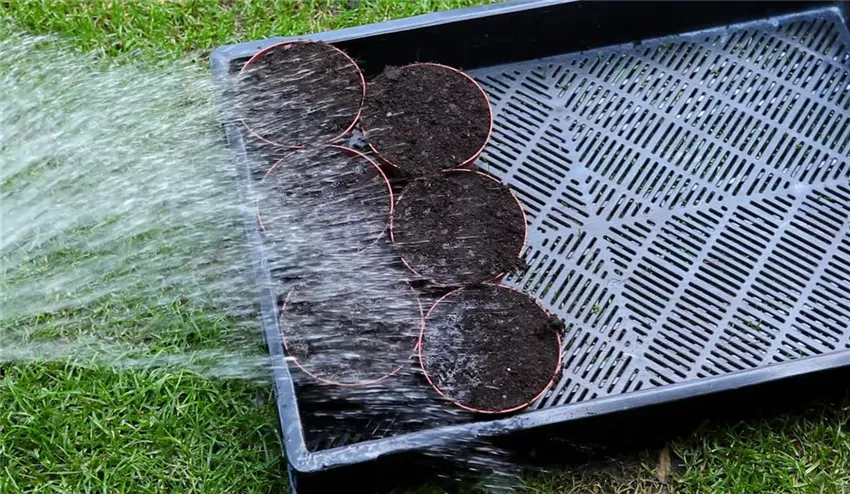 Blaukissen - Pikieren (3) Stellen Sie die mit Erde gefüllten Töpfe in eine Kunststoffgitterbox. Gehen Sie damit nach draußen und gießen Sie mit einer Gießkanne mit Brauseaufsatz darüber. Drinnen können Sie die Erde mit einer Pflanzensprühflasche befeuchten.