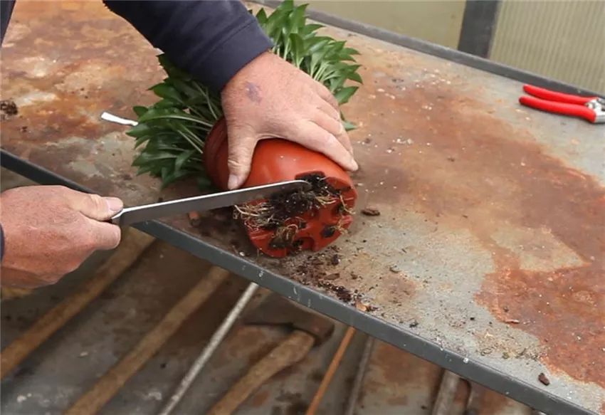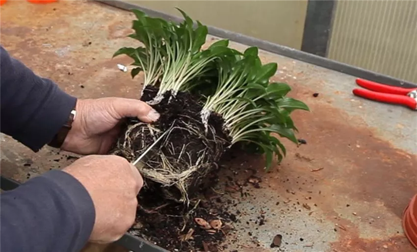 Funkien - Teilen und Einpflanzen (2) Wenn die Funkie oberirdisch viele Blätter gebildet hat, haben sich auch die Wurzeln entsprechend vermehrt. Gegebenenfalls müssen Sie zunächst Wurzeln entfernen, die bereits durch die Löcher des Gefäßes gewachsen sind.