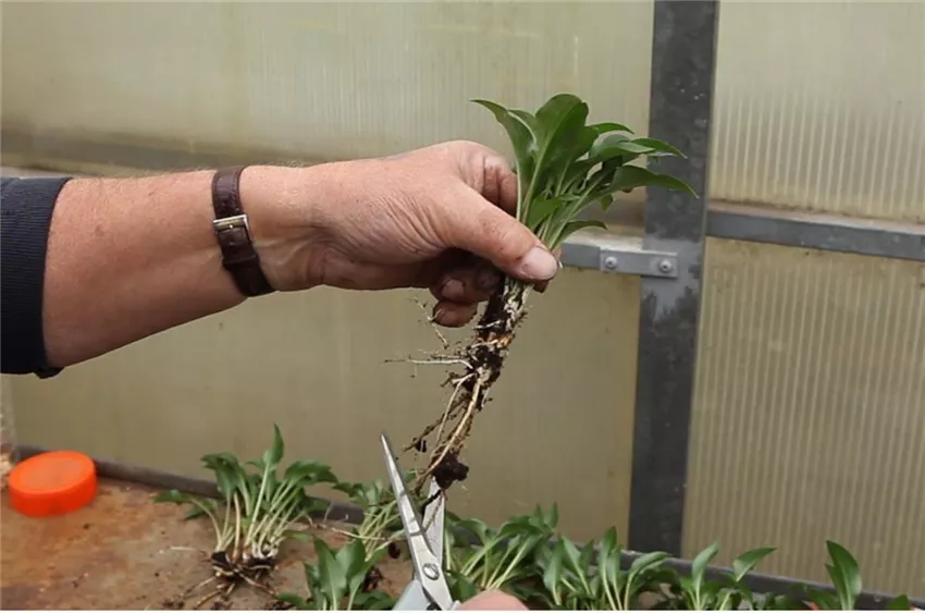 Funkien - Teilen und Einpflanzen (4) Mit einer scharfen Schere sollten Sie diejenigen Wurzeln noch etwas einkürzen, die bei der Teilung verletzt worden sind. So wird neues Wurzelwachstum angeregt.