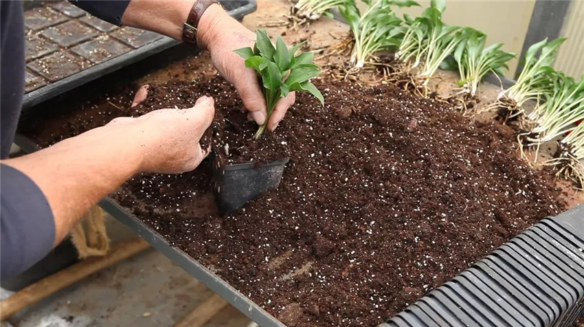 Funkien - Teilen und Einpflanzen (5) Nun können Sie die kleinen Pflänzchen in lockere, humusreiche Erde pflanzen.