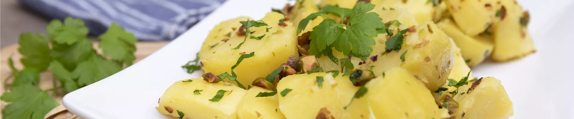 Die Kartoffeln abgießen und kurz mit offenem Deckel ausdampfen lassen. Die Butter und das Olivenöl in der Pfanne zerlassen und die Kartoffeln darin schwenken. Petersilie und Pistazien untermischen und servieren. Die Kartoffeln eignen sich hervorragend als Beilage zu Fleisch oder Fisch.