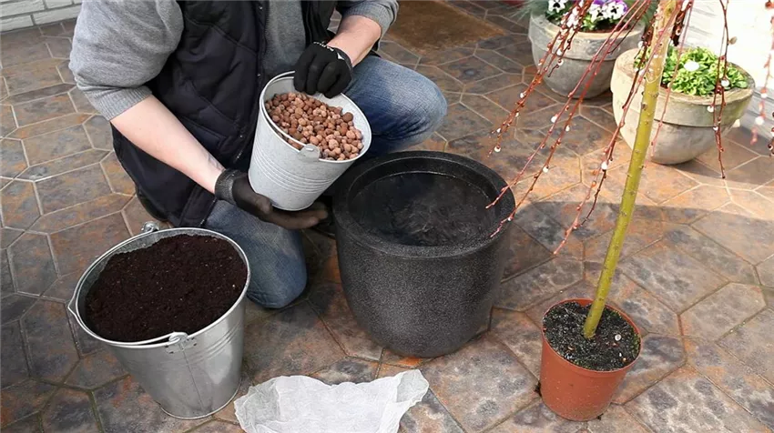 Mit dieser untersten Einschichtung sorgen Sie dafür, dass sich im Topf keine Staunässe bildet, denn wie die meisten Pflanzen, verträgt auch diese Weide keine nassen Füße.